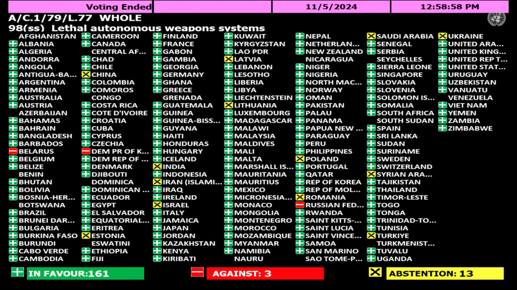 On 5 November 2024, the First Committee of the UN General Assembly adopted a resolution on autonomous weapons systems for the second year running, mindful of the “serious challenges and concerns that new and emerging technological applications in the military domain, including those related to artificial intelligence and autonomy in weapons systems, [raise] from humanitarian, legal, security, technological and ethical perspectives.”