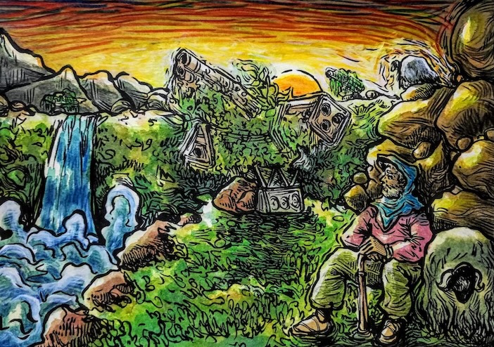 I have tried to encapsulate this notion with a peaceful landscape that has been built upon the ruins of Weapons of Mass Destruction (WMDs) as a shepherd glances through the horizon. Peace is not exactly defined as a moment of happiness, joy, and delight all the time. But here, contentment is the key emotion for me. The pure contentment that we derive from the potential regulation of automated weapons systems is something I hope to see materialise in my lifetime.